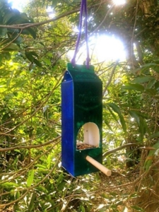 Infine, un altro progetto adatto ai bambini. Un vecchio cartone di latte farà un adorabile alimentatore. Puoi dipingere (o far dipingere ai bambini) un cartone di latte –il classico tetra brick- e poi tagliare una finestra per il mangime. Con una bacchetta di legno o un cucchiaio di legno, o anche un rametto secco, puoi creare un punto di appoggio per i volatili. In questo modo gli uccellini avranno un posto dove atterrare quando vogliono mangiare e potranno alimentarsi facilmente inserendo il capo dalla finestra creata nel cartone. Con uno spago poi, potrai creare un gancio per appenderela mangiatoia. Questa è molto leggera, quindi, abbi cura di scegliere un posto non troppo ventilato.