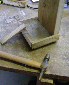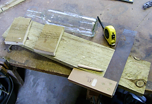 Una tavoletta più piccola ti servirà per contenere il mangime che scende dalla bottiglia e per questo sarà utile un bordo realizzato sempre con una bacchetta di legno. Vedi la foto successiva.