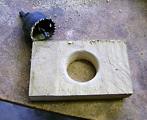 Devi poi realizzare una tavoletta da usare come base per il mangime e supporto per la bottiglia, forandola al centro con una fresa a bicchiere.
