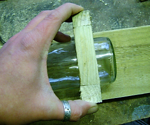 Dovrai costruire una piccola struttura di legno. Anche qui puoi usare vecchio materiale avanzato o anche disassemblare una vecchia cassetta in legno o un vecchio pallet da trasporto per recuperare quanto ti serve. Dovrai recuperare una bacchetta squadrata, o anche realizzarla partendo da una tavoletta, per realizzare una sorta di “cintura della bottiglia.